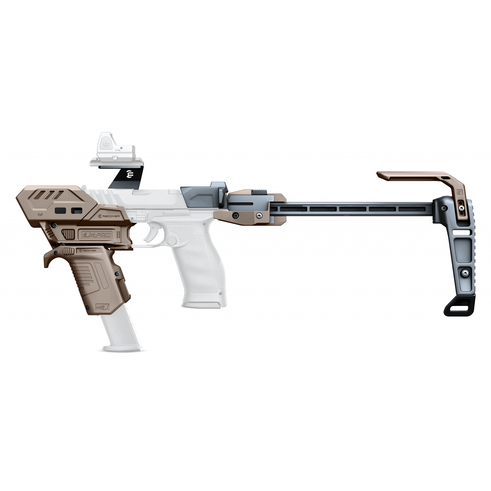 Ce kit complet SPRO est conçu pour optimiser les performances et la maniabilité du Walther PDP. Il comprend des adaptateurs PDP, un levier d'armement, un cache-flamme avant, un adaptateur de crosse avec crosse, ainsi qu'un rail supérieur pour le montage d'accessoires. Le MGX assure une meilleure prise en main, tandis que le rehausseur de joue améliore l'alignement et le confort de visée.