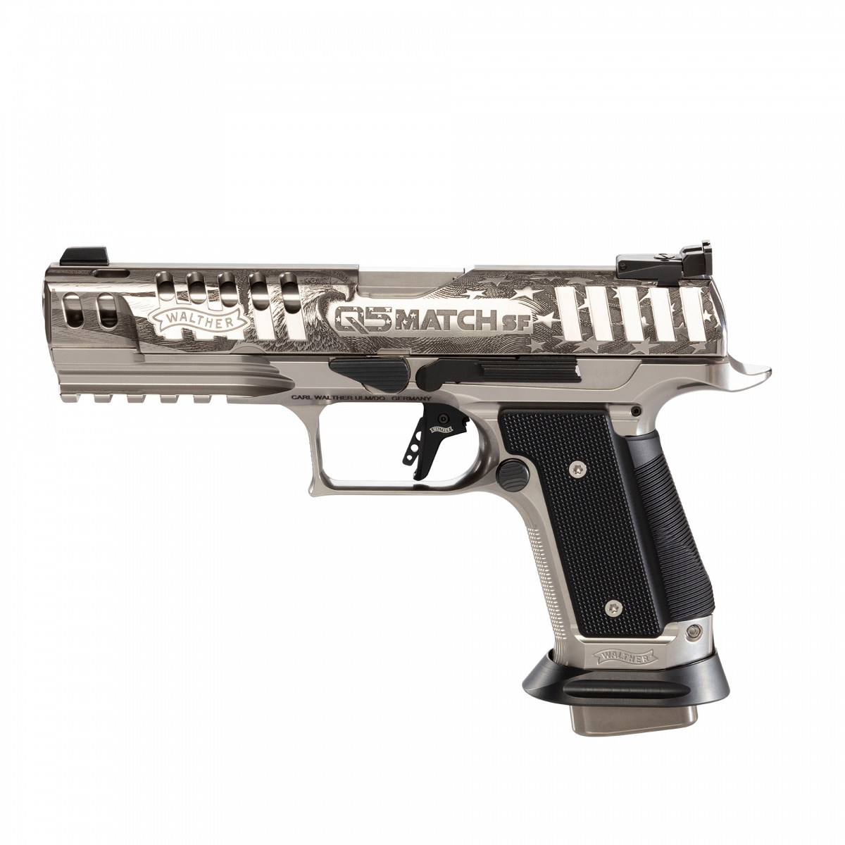 Le Walther Q5 Match SF Patriot se distingue par une gravure spéciale par Bottega Giovanelli en Italie, sublimée par un polissage soigné. Cette édition spéciale est équipée d'une détente Dynamic Performance et de fonds de chargeur en acier.