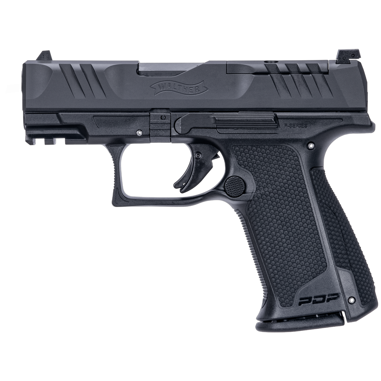 Le Walther PDP F-Series est le premier pistolet de service conçu pour une ergonomie compact spécifiquement adapté aux petites mains. Sa texture de préhension Performance Duty garantit un maintien optimal quelles que soient les conditions. L'arme dispose d'une hausse réglable en hauteur et en dérive, compatible optique (co-witness ready), d'un indicateur de chambre chargée, d'un verrou de chargeur réversible et d'un arrêtoir de culasse ambidextre. Le rail MIL-STD-1913 permet le montage d'accessoires.