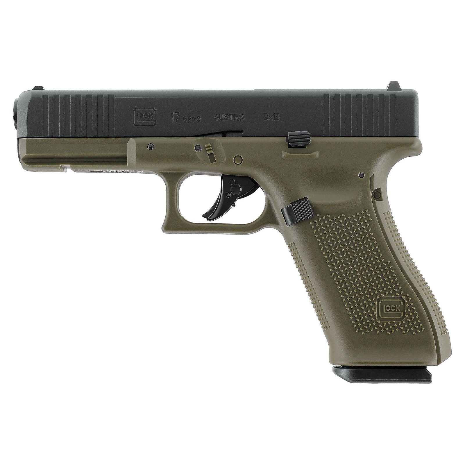 Le Glock 17 Gen5 CO2, avec sa carcasse couleur Battlefield Green associée à une culasse noire, séduit par son contraste esthétique et sa fidélité au modèle original.