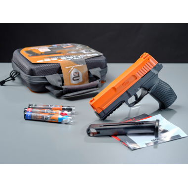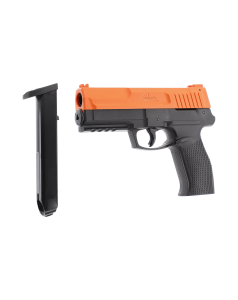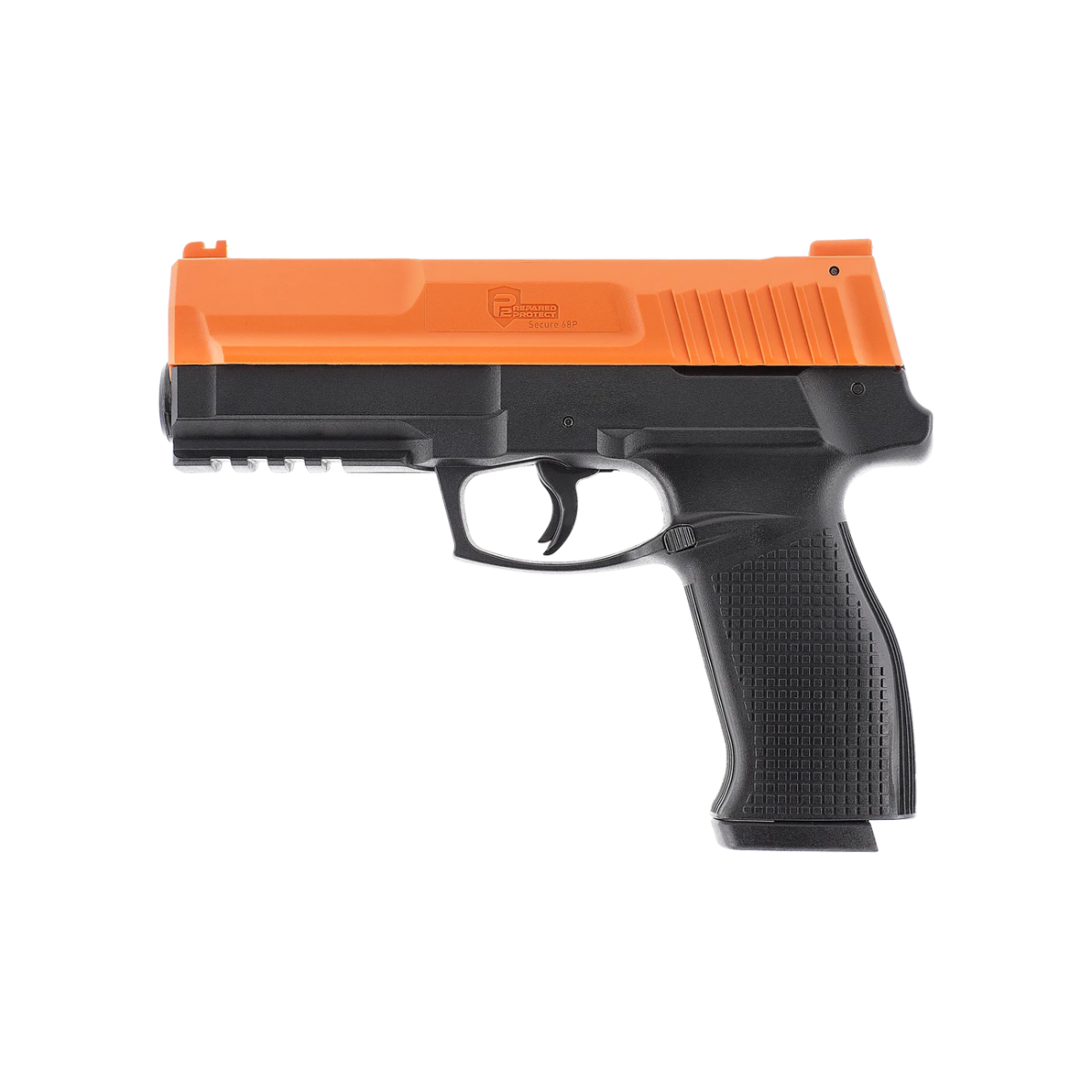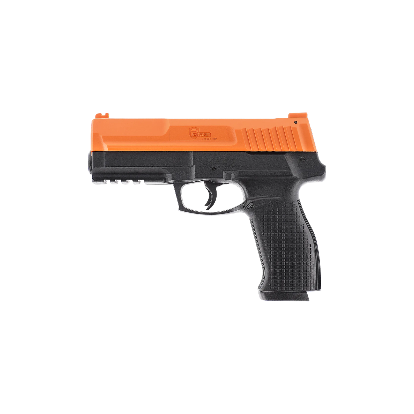 Le pack P2P Secure 68P en calibre .68 développe une énergie de 16 joules et marque une évolution majeure dans la technologie des marqueurs P2P. Il intègre le système Quick-Piercing associé au Response-Ready Trigger, qui perce automatiquement la capsule CO2 à la première pression sur la détente, réduisant considérablement le délai de mise en service. La capsule CO2 est positionnée sous le canon afin d'optimiser l'ergonomie de la poignée. Une protection STS limite le serrage excessif de la vis de capsule. Le chargeur accueille 6 billes et un modèle 9 coups est disponible en option. Une sécurité de chargeur empêche le tir sans chargeur inséré, complétée par une sûreté de détente. Les organes de visée à fibre optique favorisent l'acquisition rapide de la cible.